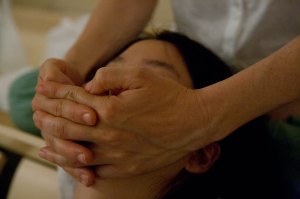 An enclosed room lined with white tile floors is heated and humidified to 92 degrees. Inside performers offer modified face massages that are choreographed to the video projected over the entrance.